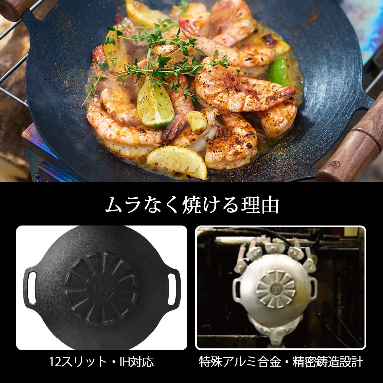 高い熱伝導率をもつ鉄板マルチグリドルだから熱伝導が均一で小さな火力でも食材を一気に焼き上げ素材の旨味を引き出します。香ばしくジューシーな焼き加減を楽しみたい方におすすめのアイテムです。