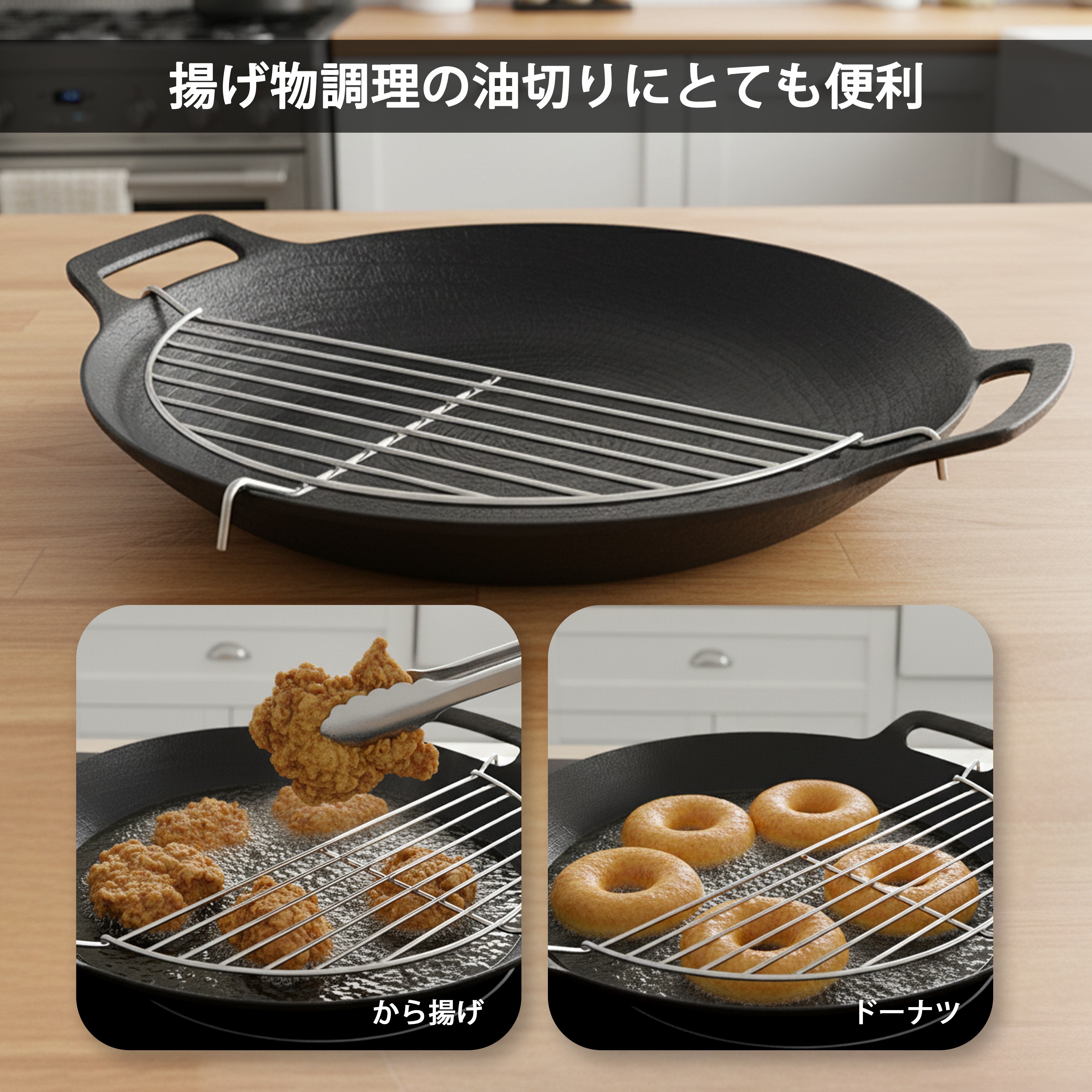 JHQ 鉄板 マルチグリドル 深型29cm専用の半月型網は、揚げ物調理の際にしっかりと油を切ってくれる便利な調理ギアです。
