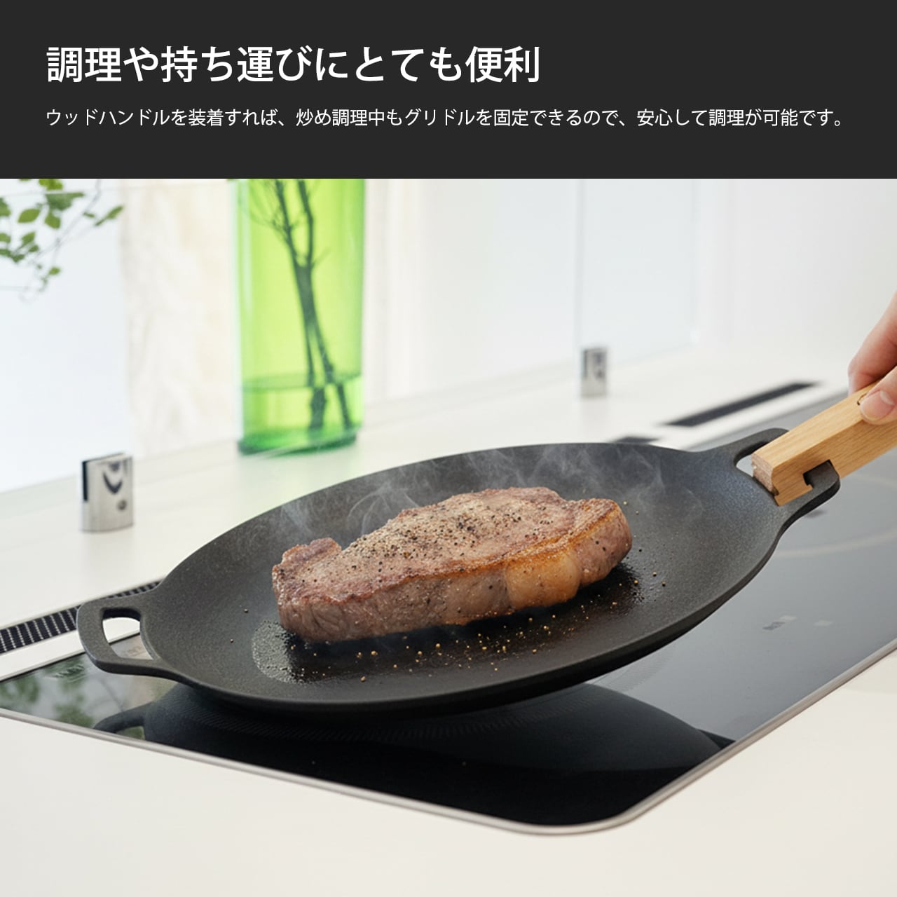 高い熱伝導率をもつJHQマルチグリドルだから熱伝導が均一で小さな火力でも食材を一気に焼き上げ素材の旨味を引き出します。香ばしくジューシーな焼き加減を楽しみたい方におすすめのアイテムです。
