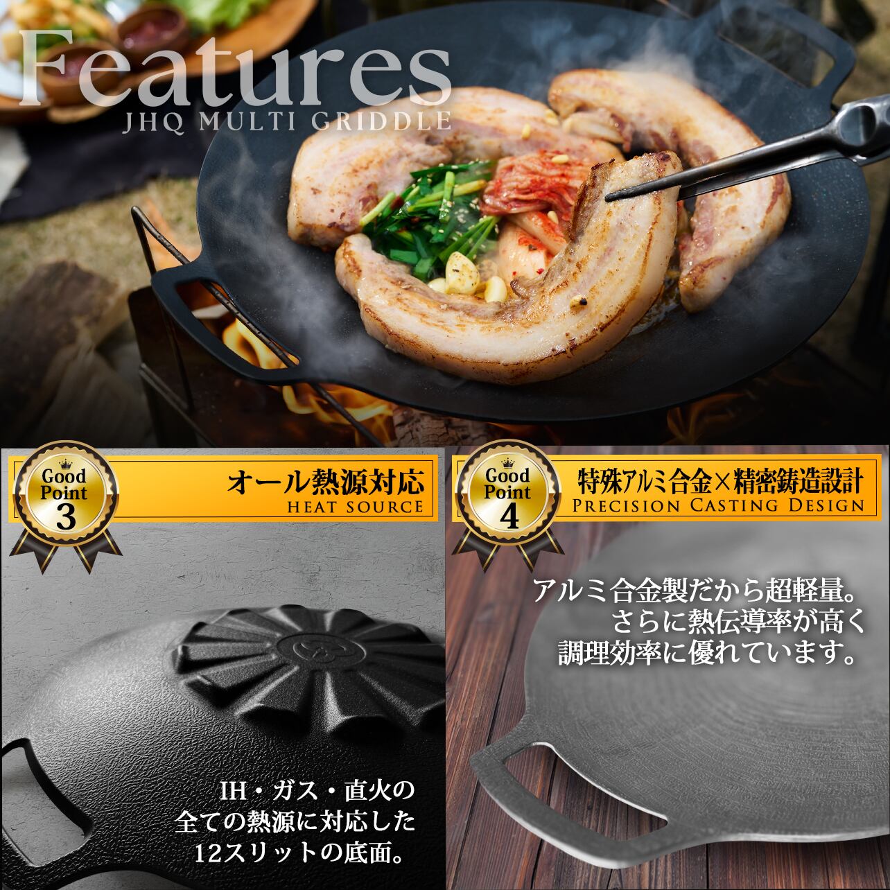 鉄板マルチグリドルは、キッチンでもアウトドアでも手軽に楽しく使える万能調理ツールです。「焼く・炒める・煮る・揚げる・茹でる・蒸す」を本格・簡単調理!