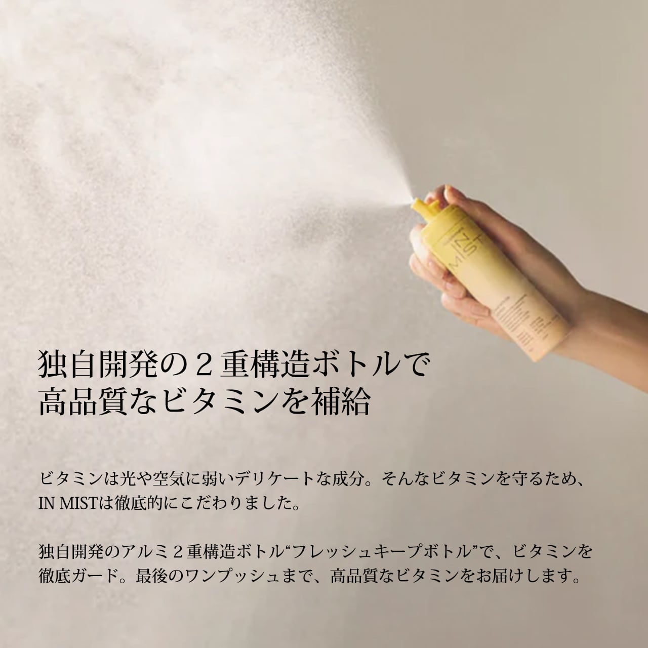 ビタミンは光や空気に弱いデリケートな成分。そんなビタミンを守るため、IN MISTは徹底的にこだわりました。