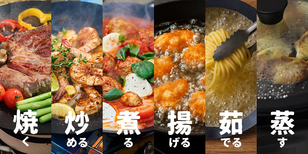 焼く・炒める・煮る・揚げる・茹でる・蒸す。