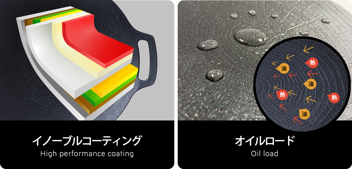 焦げ付かない秘密は、世界屈指の技術を誇る工場で施される「イノーブルコーティング」と「オイルロード」によるダブル構造。